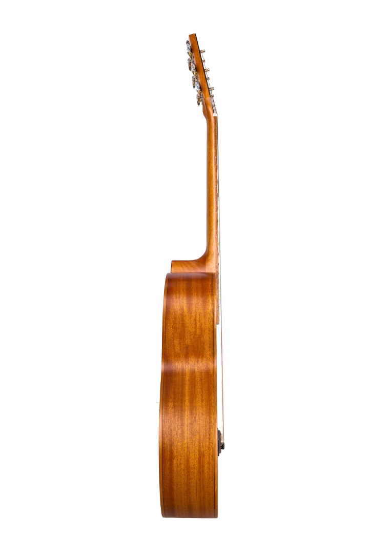Die Shape P-313-MT-T ist ausgestattet mit einer massiven Fichtendecke und Mahagoni für Boden und Zargen. Die abgerundeten Bünde und das eingefasste Griffbrett sorgen für ein angenehmes Spielerlebnis. Der 12. Bundansatz lässt die Decke freier Schwingen, was der Dynamik des Instrumentes zugutekommt.